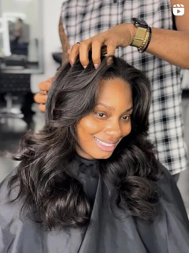 A full coverage sewing method using lace as the illusion for parting. Service includes shampoo, conduits drying and styling with service.